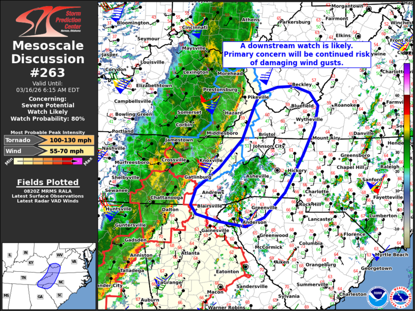16 Mar US Mesoscale Discussions Storm Prediction Center Mesoscale Discussion 263 Monday, March 16, 2026 at 5:28 am By chris 0 comments Continue reading