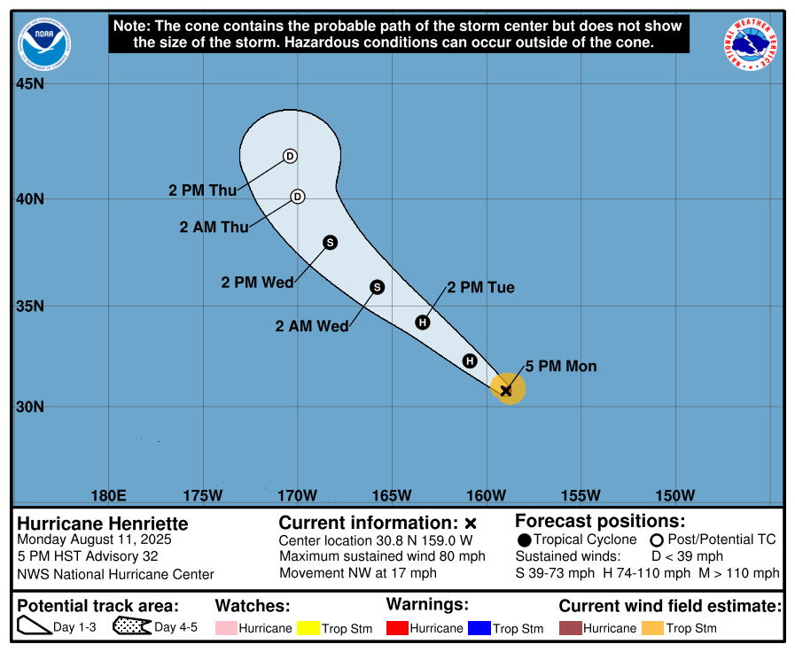 11 Aug Central Pacific Basin Tropical Cyclones Hurricane Henriette Public Advisory Monday, August 11, 2025 at 10:48 pm By chris 0 comments Continue reading