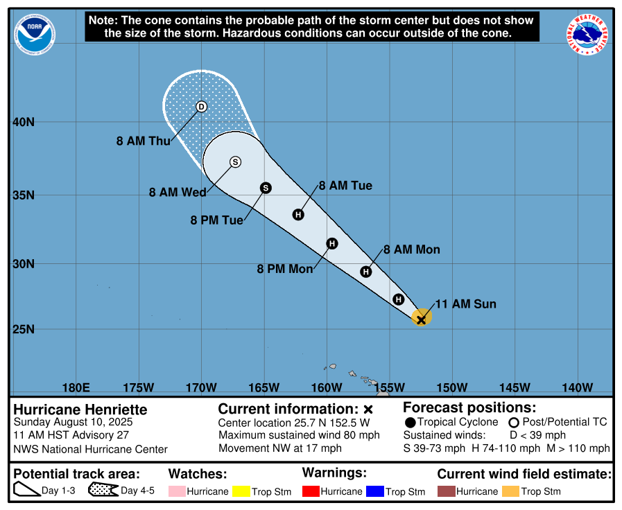 11 Aug Central Pacific Basin Tropical Cyclones Hurricane Henriette Public Advisory Monday, August 11, 2025 at 4:47 am By chris 0 comments Continue reading