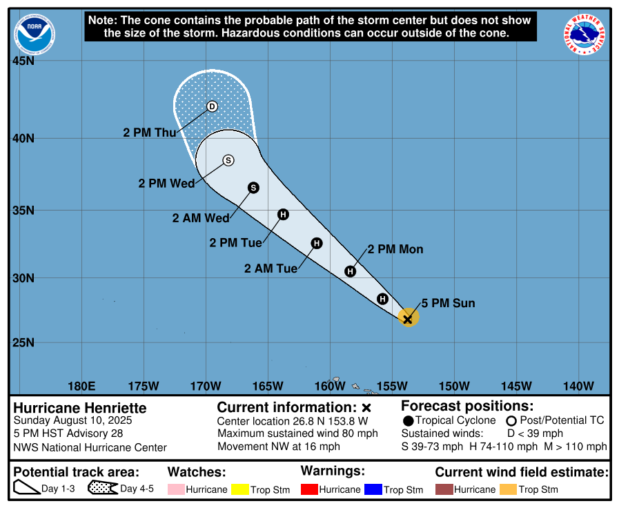 10 Aug Central Pacific Basin Tropical Cyclones Hurricane Henriette Forecast Advisory Sunday, August 10, 2025 at 10:33 pm By chris 0 comments Continue reading