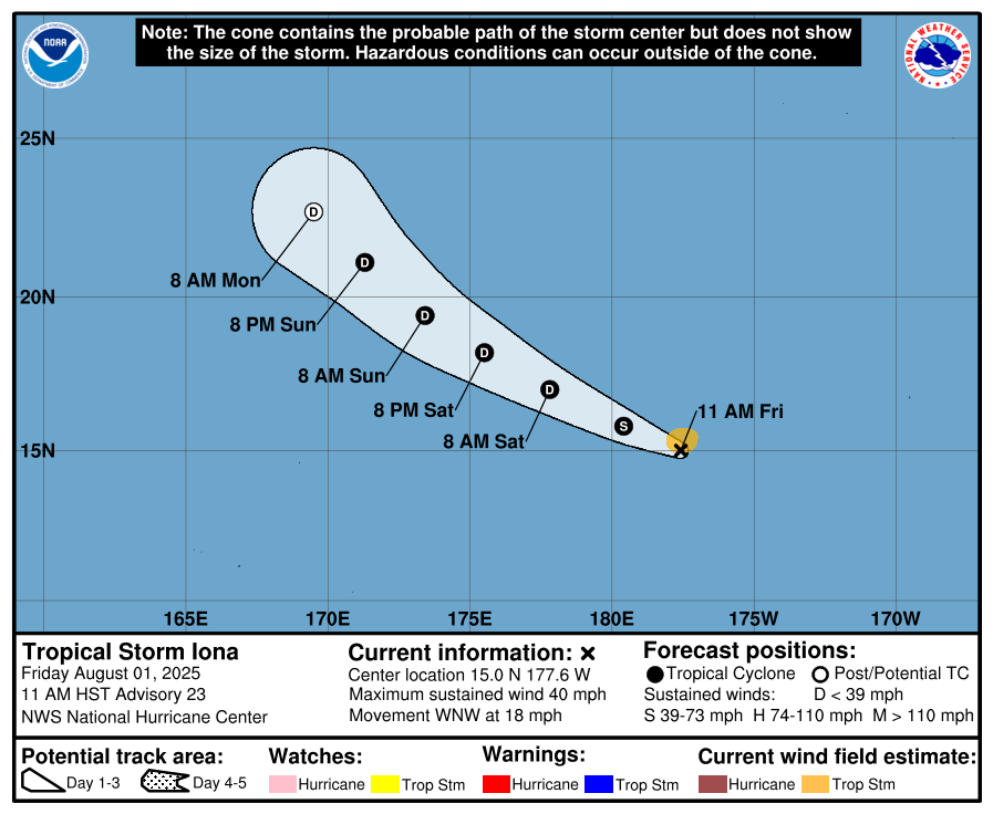 01 Aug Central Pacific Basin Tropical Cyclones Tropical Storm Iona Forecast Advisory Friday, August 1, 2025 at 4:38 pm By chris 0 comments Continue reading