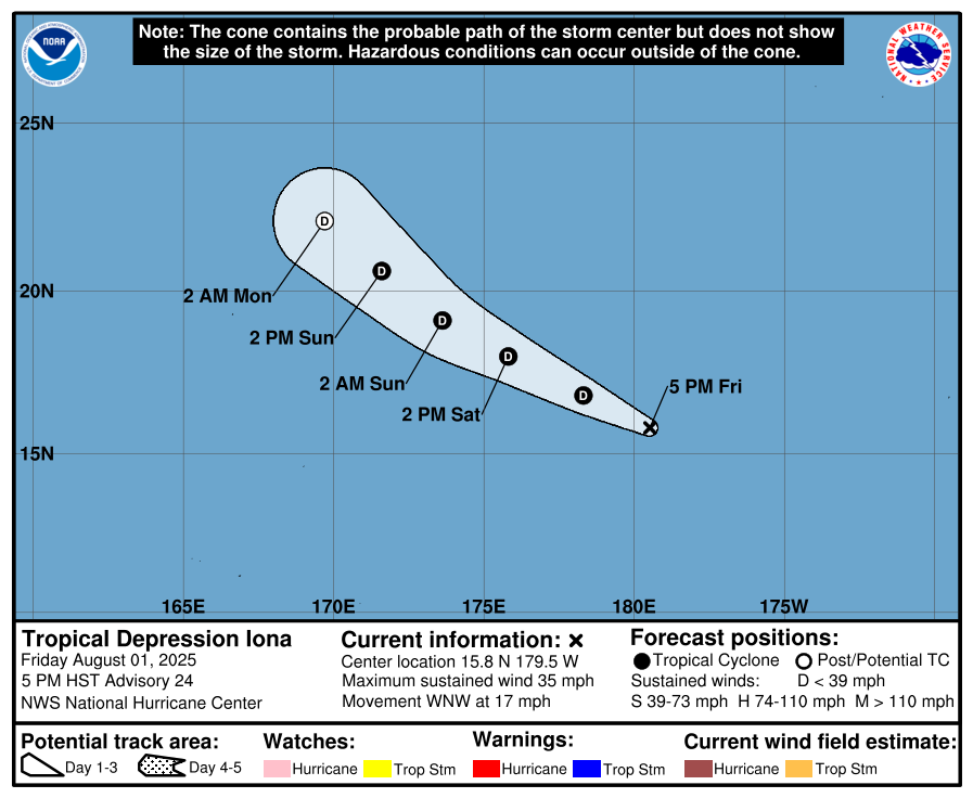 01 Aug Central Pacific Basin Tropical Cyclones Tropical Depression Iona Forecast Discussion Friday, August 1, 2025 at 10:49 pm By chris 0 comments Continue reading