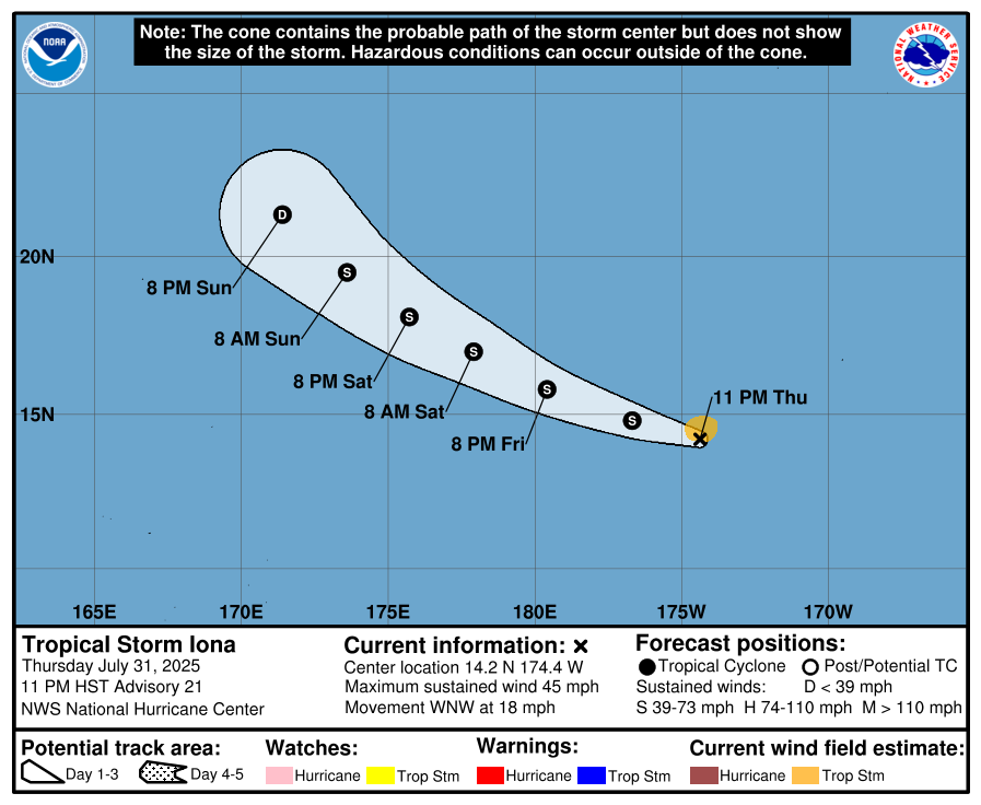 01 Aug Central Pacific Basin Tropical Cyclones Tropical Storm Iona Forecast Advisory Friday, August 1, 2025 at 4:33 am By chris 0 comments Continue reading