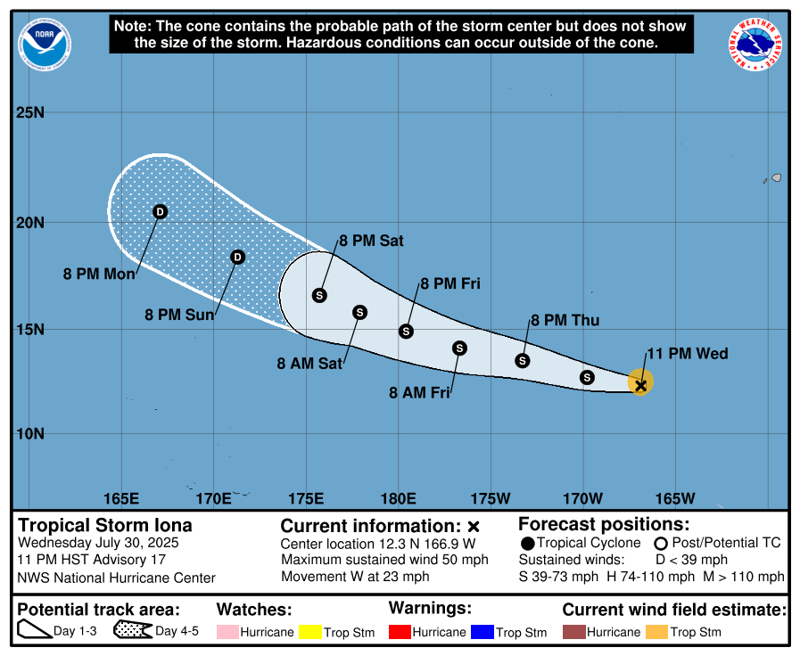 31 Jul Central Pacific Basin Tropical Cyclones TROPICAL STORM IONA Thursday, July 31, 2025 at 10:43 am By chris 0 comments Continue reading