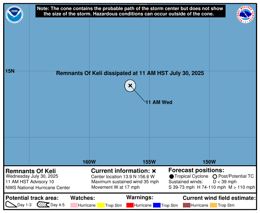 30 Jul Central Pacific Basin Tropical Cyclones Remnants of Keli Forecast Advisory Wednesday, July 30, 2025 at 5:29 pm By chris 0 comments Continue reading