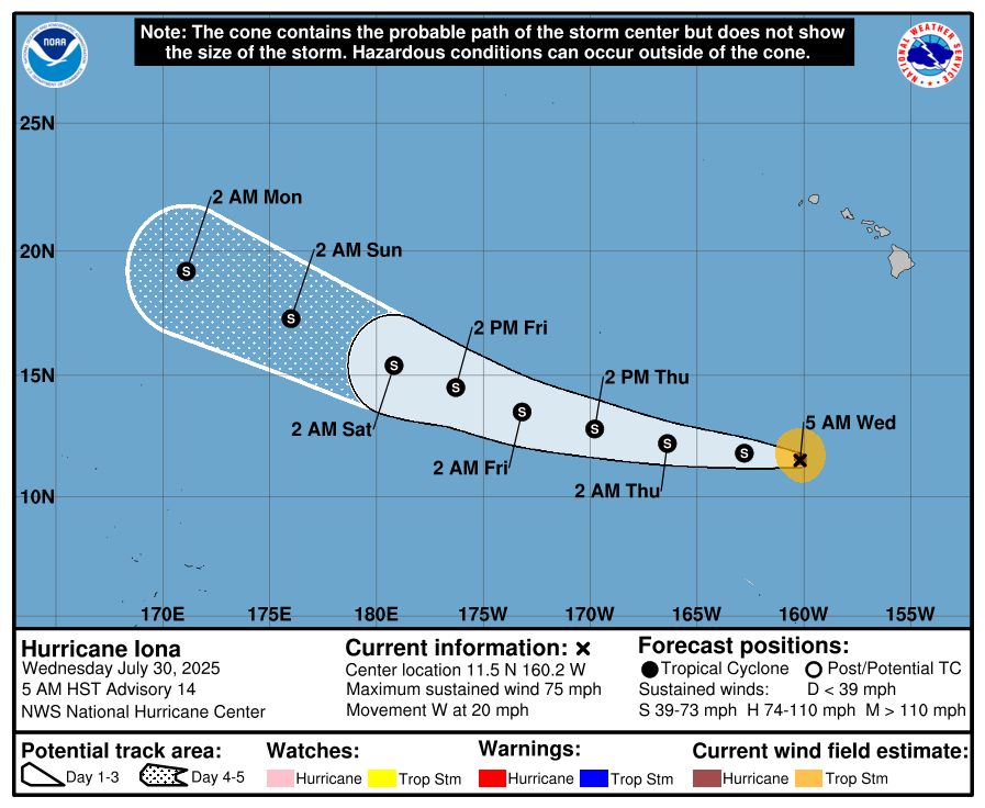 30 Jul Central Pacific Basin Tropical Cyclones Hurricane Iona Forecast Discussion Wednesday, July 30, 2025 at 4:42 am By chris 0 comments Continue reading