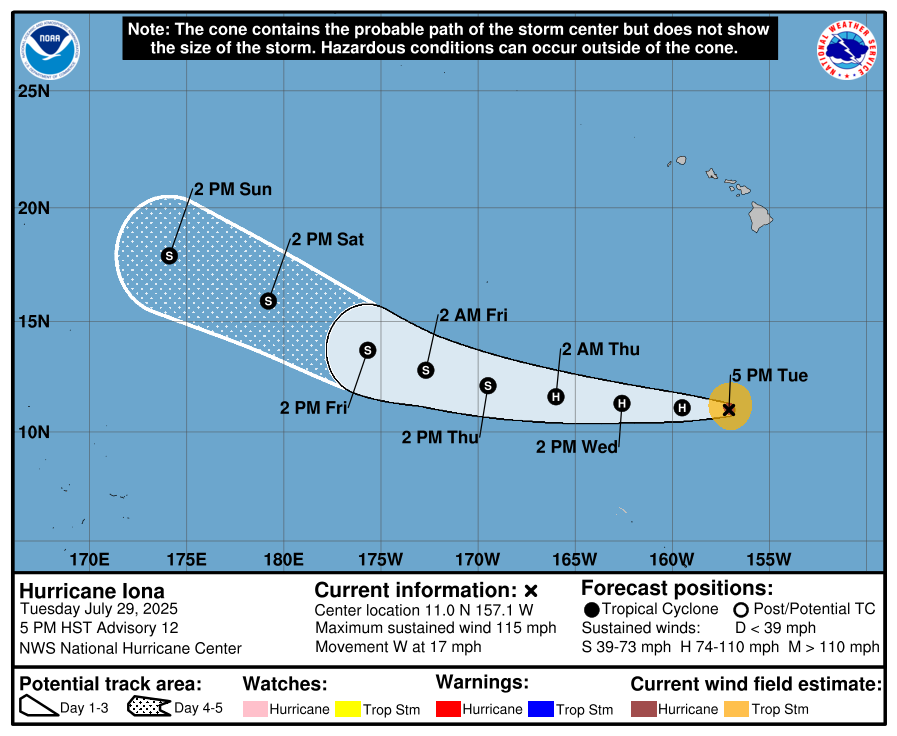 29 Jul Central Pacific Basin Tropical Cyclones Hurricane Iona Public Advisory Tuesday, July 29, 2025 at 10:46 pm By chris 0 comments Continue reading