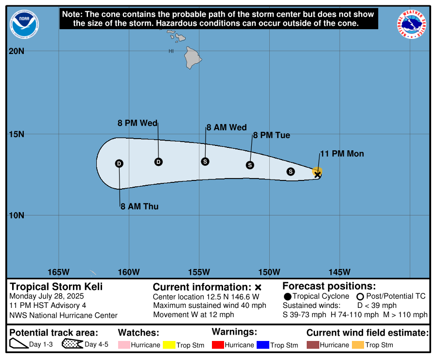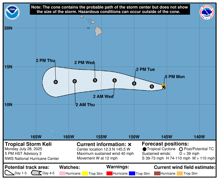 29 Jul Central Pacific Basin Tropical Cyclones Tropical Storm Keli Forecast Discussion Tuesday, July 29, 2025 at 10:36 am By chris 0 comments Continue reading