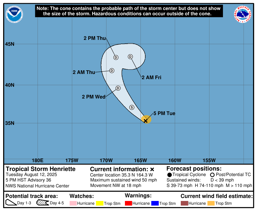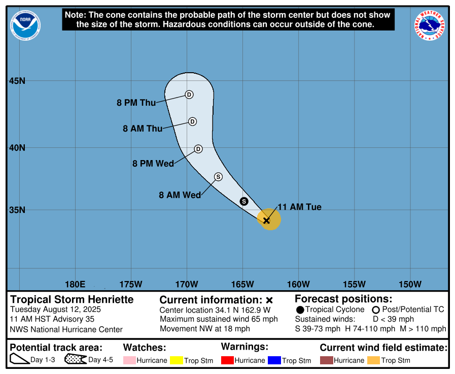 12 Aug Central Pacific Basin Tropical Cyclones Tropical Storm Henriette Forecast Discussion Tuesday, August 12, 2025 at 4:34 pm By chris 0 comments Continue reading