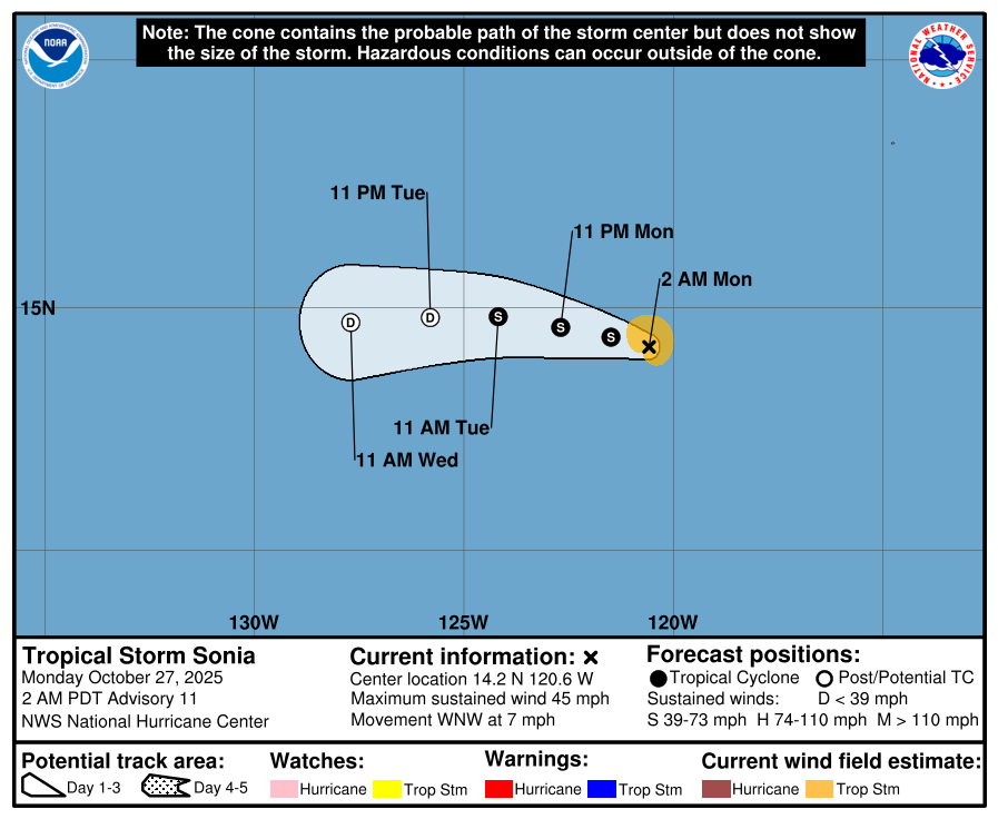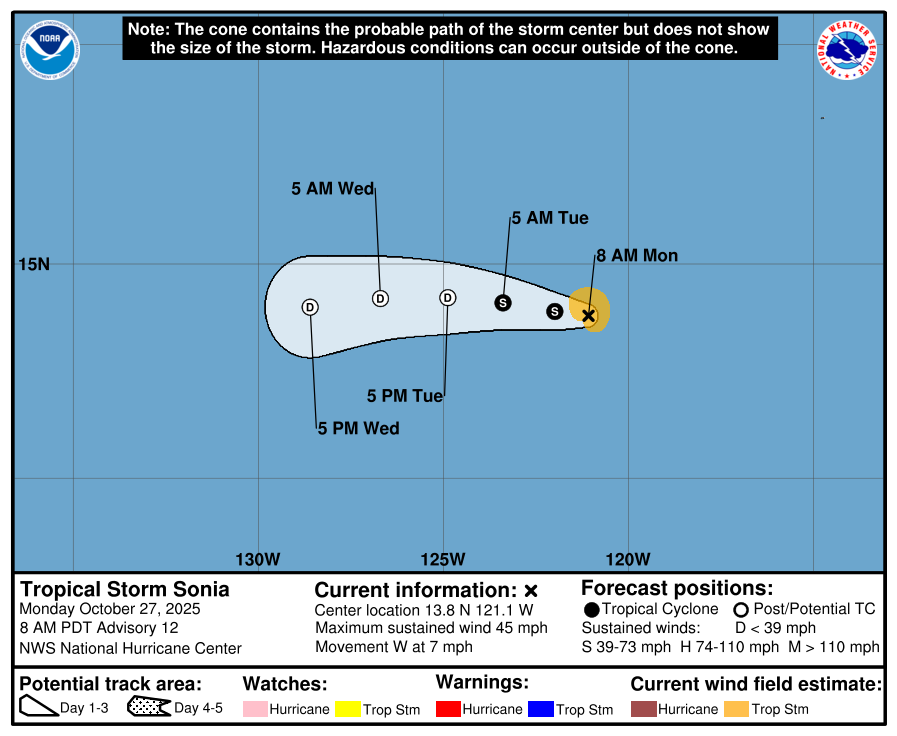 The Eastern Pacifc Basin feed is pulled directly from the National Hurricane Center and updates automatically below. Whenever a tropical cyclone (a tropical depression, tropical storm, or hurricane) or a subtropical storm has formed in the Atlantic or eastern North Pacific, the NOAA National Hurricane Center (NHC) issues tropical cyclone advisory products at least every 6 hours at 5 am, 11 am, 5 pm, and 11 pm EDT.