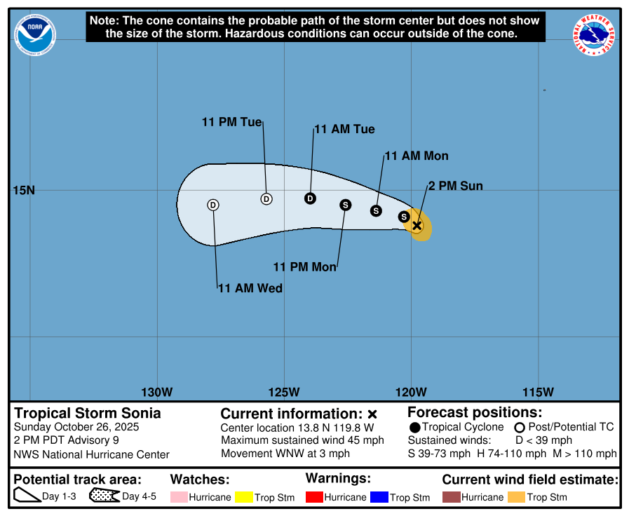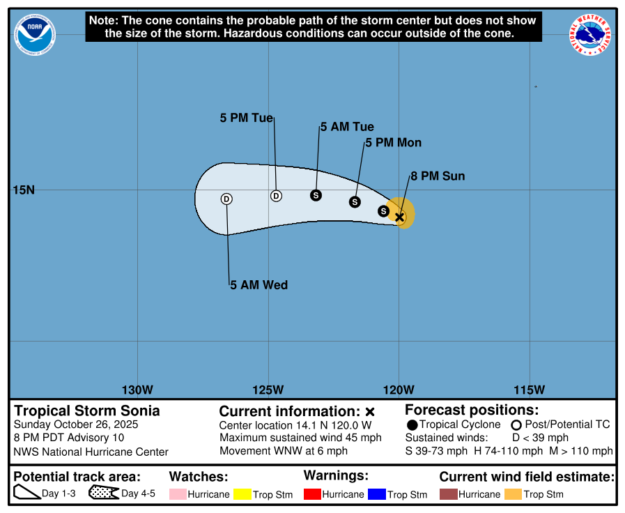 The Eastern Pacifc Basin feed is pulled directly from the National Hurricane Center and updates automatically below. Whenever a tropical cyclone (a tropical depression, tropical storm, or hurricane) or a subtropical storm has formed in the Atlantic or eastern North Pacific, the NOAA National Hurricane Center (NHC) issues tropical cyclone advisory products at least every 6 hours at 5 am, 11 am, 5 pm, and 11 pm EDT.