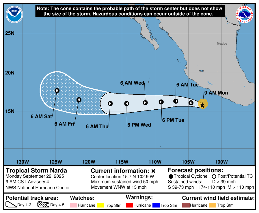 The Eastern Pacifc Basin feed is pulled directly from the National Hurricane Center and updates automatically below. Whenever a tropical cyclone (a tropical depression, tropical storm, or hurricane) or a subtropical storm has formed in the Atlantic or eastern North Pacific, the NOAA National Hurricane Center (NHC) issues tropical cyclone advisory products at least every 6 hours at 5 am, 11 am, 5 pm, and 11 pm EDT.