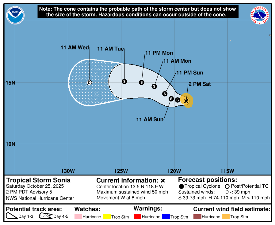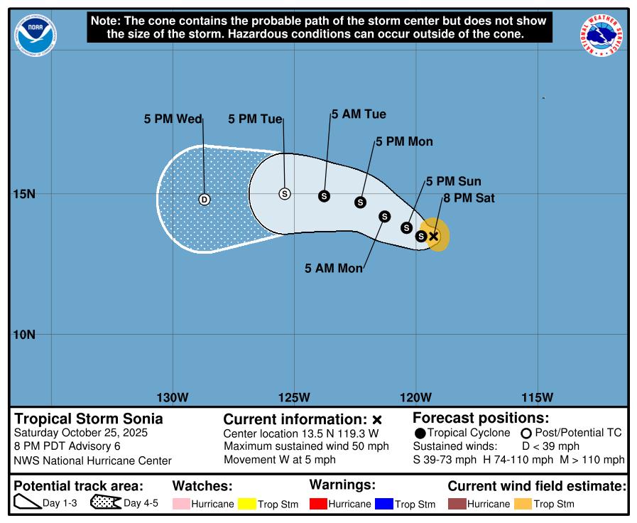 The Eastern Pacifc Basin feed is pulled directly from the National Hurricane Center and updates automatically below. Whenever a tropical cyclone (a tropical depression, tropical storm, or hurricane) or a subtropical storm has formed in the Atlantic or eastern North Pacific, the NOAA National Hurricane Center (NHC) issues tropical cyclone advisory products at least every 6 hours at 5 am, 11 am, 5 pm, and 11 pm EDT.