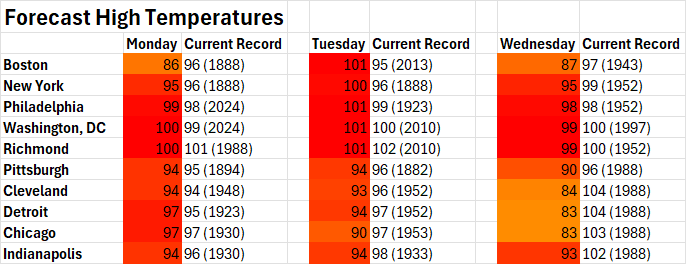 Heading into the next couple days, the heat will begin to peak in the Eastern U.S., with numerous records likely to be threatened or fall. The most impressive on the list below for some selected major cities is probably the 1888 record in New York City that should fall tomorrow or the 1923 record in Philly.