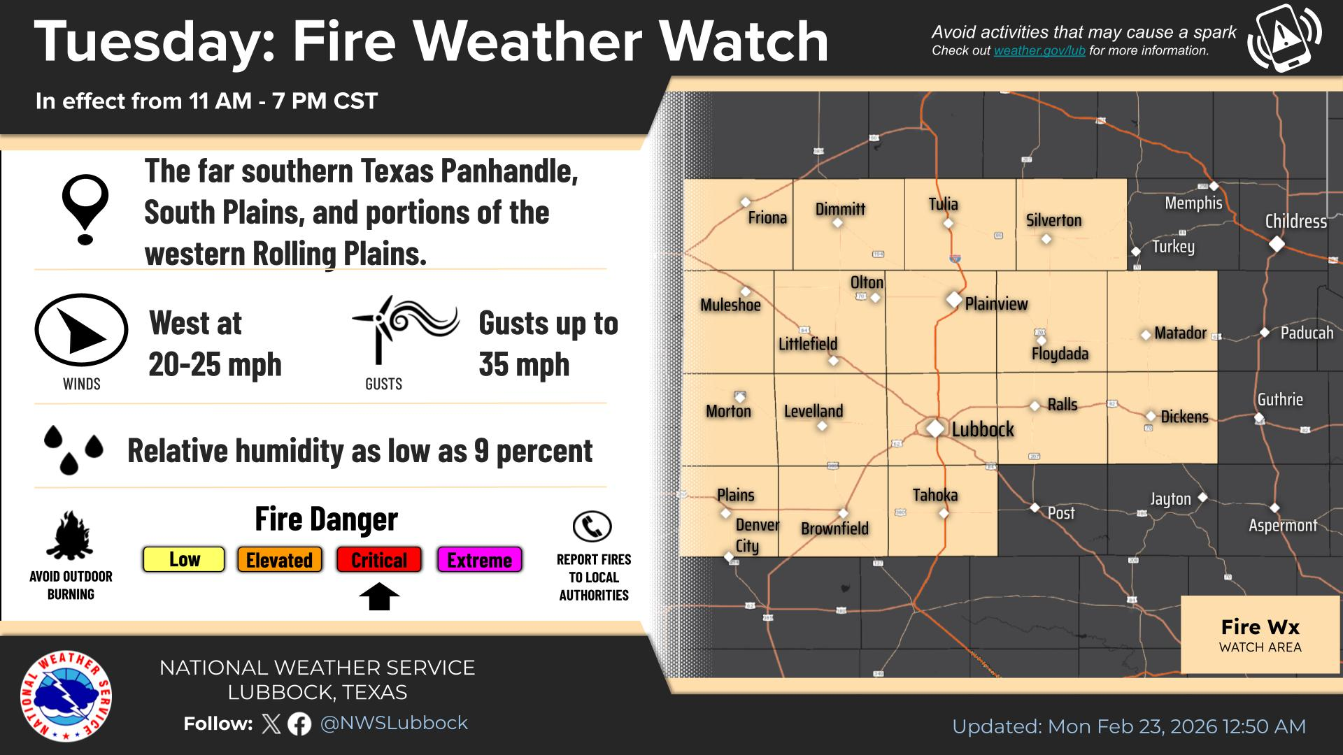 First off, the weather word for Texas is dry. Most of the state should be absent any rain at all this week, with a midweek storm cranking up well off to the east. This will mean periodic fire danger, particularly as winds kick up through the week. Conditions may be at their most considerable on Tuesday, particularly in West Texas.