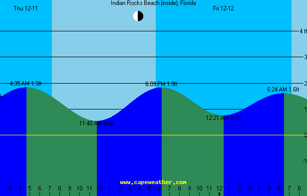Indian Rocks Beach (inside), Florida St. Marks River Entrance, Florida + Corrections: High(-1:29 *0.74) Low(-1:25 *0.74) Units are feet Thursday 2025-12-11 Last Quarter Moon Sunrise 7:12 AM EST, Sunset 5:37 PM EST Moonset 12:33 PM EST, Moonrise 12:43 AM EST High Tide: 4:35 AM EST 1.9 Low Tide: 11:40 AM EST 0.6 High Tide: 6:09 PM EST 1.9 Friday 2025-12-12 Sunrise 7:13 AM EST, Sunset 5:37 PM EST Moonrise 12:43 AM EST, Moonset 1:01 PM EST Low Tide: 12:21 AM EST 0.8 High Tide: 6:24 AM EST 1.6 Low Tide: 12:32 PM EST 0.9 High Tide: 6:59 PM EST 1.9 Saturday 2025-12-13 Sunrise 7:13 AM EST, Sunset 5:37 PM EST Moonrise 1:37 AM EST, Moonset 1:29 PM EST Low Tide: 1:47 AM EST 0.5 High Tide: 8:18 AM EST 1.6 Low Tide: 1:29 PM EST 1.1 High Tide: 7:47 PM EST 2.0 Sunday 2025-12-14 Sunrise 7:14 AM EST, Sunset 5:37 PM EST Moonrise 2:30 AM EST, Moonset 1:57 PM EST Low Tide: 2:56 AM EST 0.3 High Tide: 9:38 AM EST 1.7 Low Tide: 2:27 PM EST 1.2 High Tide: 8:33 PM EST 2.1 Monday 2025-12-15 Sunrise 7:15 AM EST, Sunset 5:38 PM EST Moonrise 3:23 AM EST, Moonset 2:28 PM EST Low Tide: 3:50 AM EST 0.0 High Tide: 10:31 AM EST 1.8 Low Tide: 3:19 PM EST 1.2 High Tide: 9:16 PM EST 2.1 Tuesday 2025-12-16 Sunrise 7:15 AM EST, Sunset 5:38 PM EST Moonrise 4:18 AM EST, Moonset 3:02 PM EST Low Tide: 4:36 AM EST -0.2 High Tide: 11:12 AM EST 1.9 Low Tide: 4:03 PM EST 1.2 High Tide: 9:56 PM EST 2.2 Wednesday 2025-12-17 Sunrise 7:16 AM EST, Sunset 5:39 PM EST Moonrise 5:14 AM EST, Moonset 3:41 PM EST Low Tide: 5:17 AM EST -0.3 High Tide: 11:48 AM EST 2.0 Low Tide: 4:43 PM EST 1.2 High Tide: 10:33 PM EST 2.3