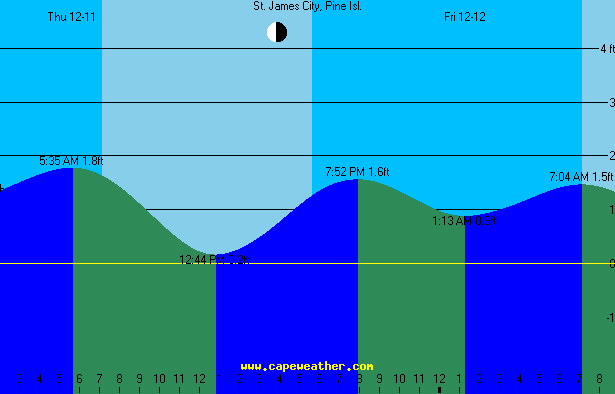 St. James City, Pine Isl. St. Petersburg, Florida + Corrections: High(-0:30 *1.04) Low(-0:44 *1.04) Units are feet Thursday 12-11-2025 Last Quarter Moon Sunrise 7:06 AM EST, Sunset 5:36 PM EST Moonset 12:30 PM EST, Moonrise 12:40 AM EST High Tide: 5:35 AM EST 1.8 Low Tide: 12:44 PM EST 0.2 High Tide: 7:52 PM EST 1.6 Friday 12-12-2025 Sunrise 7:07 AM EST, Sunset 5:37 PM EST Moonrise 12:40 AM EST, Moonset 12:58 PM EST Low Tide: 1:13 AM EST 0.9 High Tide: 7:04 AM EST 1.5 Low Tide: 1:22 PM EST 0.5 High Tide: 8:15 PM EST 1.7 Saturday 12-13-2025 Sunrise 7:07 AM EST, Sunset 5:37 PM EST Moonrise 1:33 AM EST, Moonset 1:27 PM EST Low Tide: 2:42 AM EST 0.6 High Tide: 8:56 AM EST 1.3 Low Tide: 1:58 PM EST 0.8 High Tide: 8:40 PM EST 1.9 Sunday 12-14-2025 Sunrise 7:08 AM EST, Sunset 5:37 PM EST Moonrise 2:25 AM EST, Moonset 1:56 PM EST Low Tide: 3:52 AM EST 0.3 High Tide: 10:51 AM EST 1.2 Low Tide: 2:33 PM EST 1.0 High Tide: 9:07 PM EST 2.0 Monday 12-15-2025 Sunrise 7:09 AM EST, Sunset 5:38 PM EST Moonrise 3:18 AM EST, Moonset 2:27 PM EST Low Tide: 4:46 AM EST -0.0 High Tide: 12:24 PM EST 1.3 Low Tide: 3:08 PM EST 1.2 High Tide: 9:35 PM EST 2.1 Tuesday 12-16-2025 Sunrise 7:09 AM EST, Sunset 5:38 PM EST Moonrise 4:12 AM EST, Moonset 3:02 PM EST Low Tide: 5:30 AM EST -0.3 High Tide: 1:37 PM EST 1.4 Low Tide: 3:41 PM EST 1.3 High Tide: 10:06 PM EST 2.2 Wednesday 12-17-2025 Sunrise 7:10 AM EST, Sunset 5:39 PM EST Moonrise 5:08 AM EST, Moonset 3:41 PM EST Low Tide: 6:11 AM EST -0.4 High Tide: 2:37 PM EST 1.4 Low Tide: 4:11 PM EST 1.4 High Tide: 10:38 PM EST 2.3