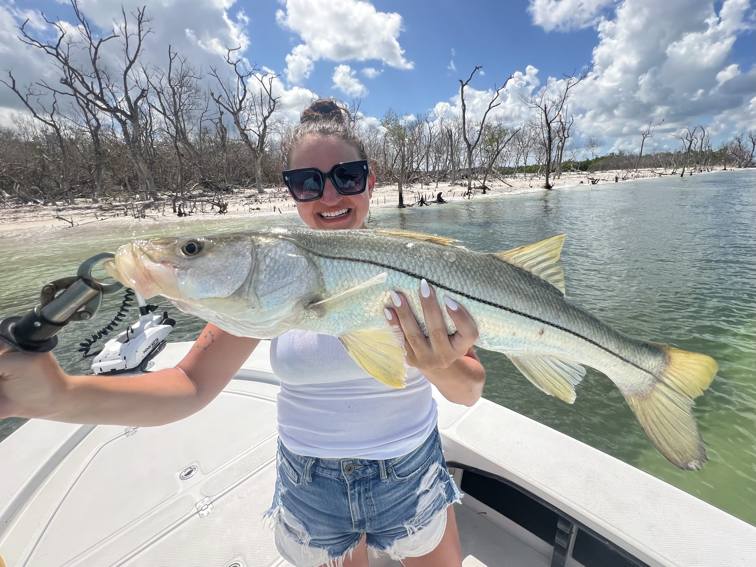 Snook fishing is a highlight of both Naples fishing and Marco Island fishing, especially during the summer months. Snook move out of the deeper backwaters and gather along beaches, passes, and mangrove points as they enter their spawning season. These ambush predators feed aggressively when the tide is moving, especially in the early morning and late evening hours.