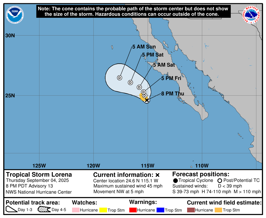 tropical storm warning (blue) and tropical storm watch (yellow). The orange circle indicates the current position of the